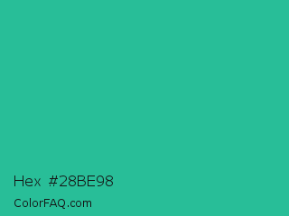 Hex #28be98 Color is a normal cyan color and the nearest color is Mountain Meadow #30ba8f. Hex code #28be98 and RGB value is rgb(40,190,152). In RGB color space, this color is composed of 16% red, 75% green, 60% blue, In CMYK color space, this color is composed of 79% cyan, 0% magenta, 20% yellow , 25% black , In HSL color space, this color has a hue angle of 165° , 65% saturation and 45% lightness.
