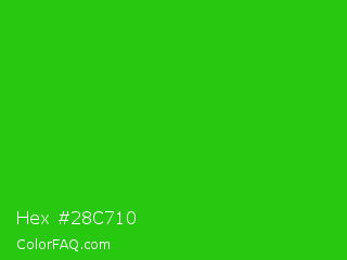 Hex #28c710 Color is a normal green color and the nearest color is Harlequin Green #46cb18. Hex code #28c710 and RGB value is rgb(40,199,16). In RGB color space, this color is composed of 16% red, 78% green, 6% blue, In CMYK color space, this color is composed of 80% cyan, 0% magenta, 92% yellow , 22% black , In HSL color space, this color has a hue angle of 112° , 85% saturation and 42% lightness.