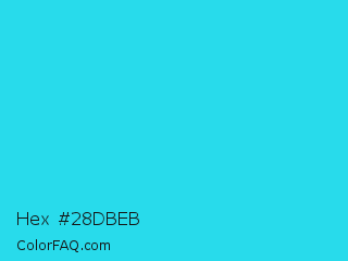 Hex #28dbeb Color is a normal cyan color and the nearest color is Loeen #15f2fd. Hex code #28dbeb and RGB value is rgb(40,219,235). In RGB color space, this color is composed of 16% red, 86% green, 92% blue, In CMYK color space, this color is composed of 83% cyan, 7% magenta, 0% yellow , 8% black , In HSL color space, this color has a hue angle of 185° , 83% saturation and 54% lightness.