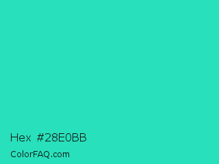 Hex #28e0bb Color is a normal cyan color and the nearest color is Turquoise PWG #30d5c8. Hex code #28e0bb and RGB value is rgb(40,224,187). In RGB color space, this color is composed of 16% red, 88% green, 73% blue, In CMYK color space, this color is composed of 82% cyan, 0% magenta, 17% yellow , 12% black , In HSL color space, this color has a hue angle of 168° , 75% saturation and 52% lightness.