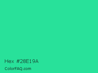 Hex #28e19a Color is a normal green color and the nearest color is Shamrock #33cc99. Hex code #28e19a and RGB value is rgb(40,225,154). In RGB color space, this color is composed of 16% red, 88% green, 60% blue, In CMYK color space, this color is composed of 82% cyan, 0% magenta, 32% yellow , 12% black , In HSL color space, this color has a hue angle of 157° , 76% saturation and 52% lightness.