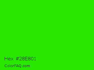 Hex #28e801 Color is a normal green color and the nearest color is Harlequin #3fff00. Hex code #28e801 and RGB value is rgb(40,232,1). In RGB color space, this color is composed of 16% red, 91% green, 0% blue, In CMYK color space, this color is composed of 83% cyan, 0% magenta, 100% yellow , 9% black , In HSL color space, this color has a hue angle of 110° , 99% saturation and 46% lightness.