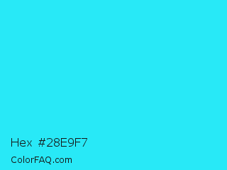 Hex #28e9f7 Color is a normal cyan color and the nearest color is Loeen #15f2fd. Hex code #28e9f7 and RGB value is rgb(40,233,247). In RGB color space, this color is composed of 16% red, 91% green, 97% blue, In CMYK color space, this color is composed of 84% cyan, 6% magenta, 0% yellow , 3% black , In HSL color space, this color has a hue angle of 184° , 93% saturation and 56% lightness.