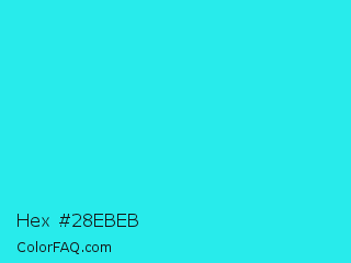 Hex #28ebeb Color is a normal cyan color and the nearest color is Loeen #15f2fd. Hex code #28ebeb and RGB value is rgb(40,235,235). In RGB color space, this color is composed of 16% red, 92% green, 92% blue, In CMYK color space, this color is composed of 83% cyan, 0% magenta, 0% yellow , 8% black , In HSL color space, this color has a hue angle of 180° , 83% saturation and 54% lightness.