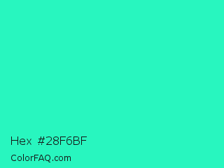 Hex #28f6bf Color is a normal cyan color and the nearest color is Turquoise PWG #30d5c8. Hex code #28f6bf and RGB value is rgb(40,246,191). In RGB color space, this color is composed of 16% red, 96% green, 75% blue, In CMYK color space, this color is composed of 84% cyan, 0% magenta, 22% yellow , 4% black , In HSL color space, this color has a hue angle of 164° , 92% saturation and 56% lightness.