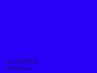 Hex #2900f8 Color is a normal indigo color and the nearest color is Electric Ultramarine #3f00ff. Hex code #2900f8 and RGB value is rgb(41,0,248). In RGB color space, this color is composed of 16% red, 0% green, 97% blue, In CMYK color space, this color is composed of 83% cyan, 100% magenta, 0% yellow , 3% black , In HSL color space, this color has a hue angle of 250° , 100% saturation and 49% lightness.