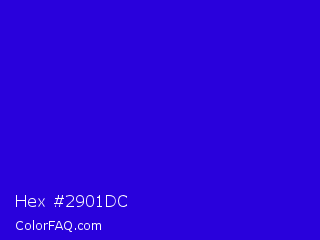 Hex #2901dc Color is a normal indigo color and the nearest color is Interdimensional Blue #360ccc. Hex code #2901dc and RGB value is rgb(41,1,220). In RGB color space, this color is composed of 16% red, 0% green, 86% blue, In CMYK color space, this color is composed of 81% cyan, 100% magenta, 0% yellow , 14% black , In HSL color space, this color has a hue angle of 251° , 99% saturation and 43% lightness.