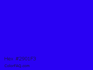 Hex #2901f3 Color is a normal indigo color and the nearest color is Electric Ultramarine #3f00ff. Hex code #2901f3 and RGB value is rgb(41,1,243). In RGB color space, this color is composed of 16% red, 0% green, 95% blue, In CMYK color space, this color is composed of 83% cyan, 100% magenta, 0% yellow , 5% black , In HSL color space, this color has a hue angle of 250° , 99% saturation and 48% lightness.