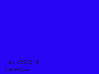 Hex #2905f4 Color is a normal indigo color and the nearest color is Electric Ultramarine #3f00ff. Hex code #2905f4 and RGB value is rgb(41,5,244). In RGB color space, this color is composed of 16% red, 2% green, 96% blue, In CMYK color space, this color is composed of 83% cyan, 98% magenta, 0% yellow , 4% black , In HSL color space, this color has a hue angle of 249° , 96% saturation and 49% lightness.