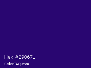 Hex #290671 Color is a dark indigo color and the nearest color is Paris M #26056a. Hex code #290671 and RGB value is rgb(41,6,113). In RGB color space, this color is composed of 16% red, 2% green, 44% blue, In CMYK color space, this color is composed of 64% cyan, 95% magenta, 0% yellow , 56% black , In HSL color space, this color has a hue angle of 260° , 90% saturation and 23% lightness.