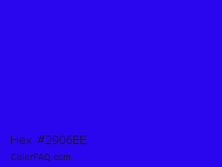 Hex #2906ee Color is a normal indigo color and the nearest color is Bluebonnet #1c1cf0. Hex code #2906ee and RGB value is rgb(41,6,238). In RGB color space, this color is composed of 16% red, 2% green, 93% blue, In CMYK color space, this color is composed of 83% cyan, 97% magenta, 0% yellow , 7% black , In HSL color space, this color has a hue angle of 249° , 95% saturation and 48% lightness.