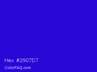Hex #2907d7 Color is a normal indigo color and the nearest color is Interdimensional Blue #360ccc. Hex code #2907d7 and RGB value is rgb(41,7,215). In RGB color space, this color is composed of 16% red, 3% green, 84% blue, In CMYK color space, this color is composed of 81% cyan, 97% magenta, 0% yellow , 16% black , In HSL color space, this color has a hue angle of 250° , 94% saturation and 44% lightness.
