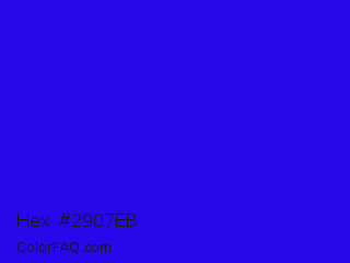 Hex #2907eb Color is a normal indigo color and the nearest color is Bluebonnet #1c1cf0. Hex code #2907eb and RGB value is rgb(41,7,235). In RGB color space, this color is composed of 16% red, 3% green, 92% blue, In CMYK color space, this color is composed of 83% cyan, 97% magenta, 0% yellow , 8% black , In HSL color space, this color has a hue angle of 249° , 94% saturation and 47% lightness.