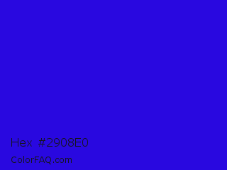 Hex #2908e0 Color is a normal indigo color and the nearest color is Interdimensional Blue #360ccc. Hex code #2908e0 and RGB value is rgb(41,8,224). In RGB color space, this color is composed of 16% red, 3% green, 88% blue, In CMYK color space, this color is composed of 82% cyan, 96% magenta, 0% yellow , 12% black , In HSL color space, this color has a hue angle of 249° , 93% saturation and 45% lightness.