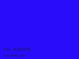 Hex #290efb Color is a normal indigo color and the nearest color is Bluebonnet #1c1cf0. Hex code #290efb and RGB value is rgb(41,14,251). In RGB color space, this color is composed of 16% red, 5% green, 98% blue, In CMYK color space, this color is composed of 84% cyan, 94% magenta, 0% yellow , 2% black , In HSL color space, this color has a hue angle of 247° , 97% saturation and 52% lightness.