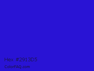 Hex #2913d5 Color is a normal indigo color and the nearest color is Interdimensional Blue #360ccc. Hex code #2913d5 and RGB value is rgb(41,19,213). In RGB color space, this color is composed of 16% red, 7% green, 84% blue, In CMYK color space, this color is composed of 81% cyan, 91% magenta, 0% yellow , 16% black , In HSL color space, this color has a hue angle of 247° , 84% saturation and 45% lightness.