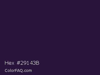 Hex #29143b Color is a very dark purple color and the nearest color is Revolver #2c1632. Hex code #29143b and RGB value is rgb(41,20,59). In RGB color space, this color is composed of 16% red, 8% green, 23% blue, In CMYK color space, this color is composed of 31% cyan, 66% magenta, 0% yellow , 77% black , In HSL color space, this color has a hue angle of 272° , 49% saturation and 15% lightness.