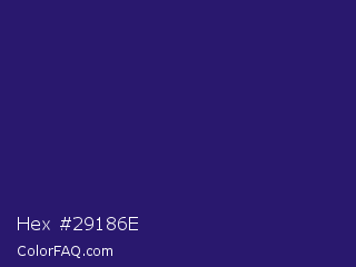 Hex #29186e Color is a dark indigo color and the nearest color is Persian Indigo #32127a. Hex code #29186e and RGB value is rgb(41,24,110). In RGB color space, this color is composed of 16% red, 9% green, 43% blue, In CMYK color space, this color is composed of 63% cyan, 78% magenta, 0% yellow , 57% black , In HSL color space, this color has a hue angle of 252° , 64% saturation and 26% lightness.
