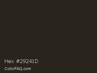 Hex #29241d Color is a very dark orange color and the nearest color is Zeus #292319. Hex code #29241d and RGB value is rgb(41,36,29). In RGB color space, this color is composed of 16% red, 14% green, 11% blue, In CMYK color space, this color is composed of 0% cyan, 12% magenta, 29% yellow , 84% black , In HSL color space, this color has a hue angle of 35° , 17% saturation and 14% lightness.