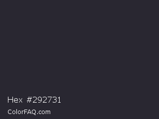 Hex #292731 Color is a very dark indigo color and the nearest color is Baltic Sea #2a2630. Hex code #292731 and RGB value is rgb(41,39,49). In RGB color space, this color is composed of 16% red, 15% green, 19% blue, In CMYK color space, this color is composed of 16% cyan, 20% magenta, 0% yellow , 81% black , In HSL color space, this color has a hue angle of 252° , 11% saturation and 17% lightness.