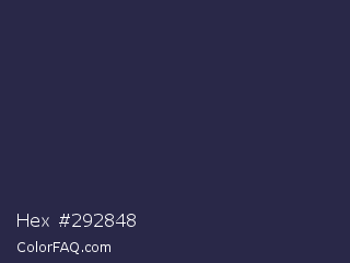 Hex #292848 Color is a very dark indigo color and the nearest color is Port Gore #251f4f. Hex code #292848 and RGB value is rgb(41,40,72). In RGB color space, this color is composed of 16% red, 16% green, 28% blue, In CMYK color space, this color is composed of 43% cyan, 44% magenta, 0% yellow , 72% black , In HSL color space, this color has a hue angle of 242° , 29% saturation and 22% lightness.