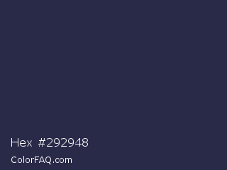 Hex #292948 Color is a very dark blue color and the nearest color is Port Gore #251f4f. Hex code #292948 and RGB value is rgb(41,41,72). In RGB color space, this color is composed of 16% red, 16% green, 28% blue, In CMYK color space, this color is composed of 43% cyan, 43% magenta, 0% yellow , 72% black , In HSL color space, this color has a hue angle of 240° , 27% saturation and 22% lightness.