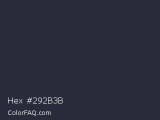 Hex #292b3b Color is a very dark blue color and the nearest color is Ebony Clay #26283b. Hex code #292b3b and RGB value is rgb(41,43,59). In RGB color space, this color is composed of 16% red, 17% green, 23% blue, In CMYK color space, this color is composed of 31% cyan, 27% magenta, 0% yellow , 77% black , In HSL color space, this color has a hue angle of 233° , 18% saturation and 20% lightness.