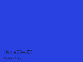 Hex #2941e0 Color is a normal blue color and the nearest color is Palatinate Blue #273be2. Hex code #2941e0 and RGB value is rgb(41,65,224). In RGB color space, this color is composed of 16% red, 25% green, 88% blue, In CMYK color space, this color is composed of 82% cyan, 71% magenta, 0% yellow , 12% black , In HSL color space, this color has a hue angle of 232° , 75% saturation and 52% lightness.