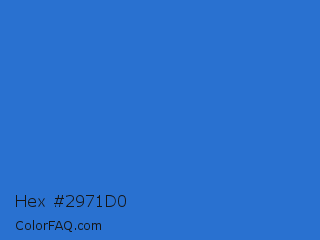 Hex #2971d0 Color is a normal blue color and the nearest color is Mariner #286acd. Hex code #2971d0 and RGB value is rgb(41,113,208). In RGB color space, this color is composed of 16% red, 44% green, 82% blue, In CMYK color space, this color is composed of 80% cyan, 46% magenta, 0% yellow , 18% black , In HSL color space, this color has a hue angle of 214° , 67% saturation and 49% lightness.