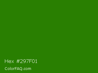Hex #297f01 Color is a dark green color and the nearest color is Napier Green #2a8000. Hex code #297f01 and RGB value is rgb(41,127,1). In RGB color space, this color is composed of 16% red, 50% green, 0% blue, In CMYK color space, this color is composed of 68% cyan, 0% magenta, 99% yellow , 50% black , In HSL color space, this color has a hue angle of 101° , 98% saturation and 25% lightness.