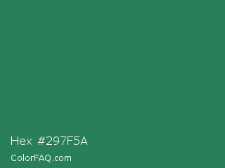 Hex #297f5a Color is a normal green color and the nearest color is Eucalyptus #278a5b. Hex code #297f5a and RGB value is rgb(41,127,90). In RGB color space, this color is composed of 16% red, 50% green, 35% blue, In CMYK color space, this color is composed of 68% cyan, 0% magenta, 29% yellow , 50% black , In HSL color space, this color has a hue angle of 154° , 51% saturation and 33% lightness.