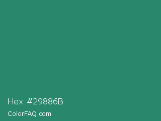 Hex #29886b Color is a normal green color and the nearest color is Eucalyptus #278a5b. Hex code #29886b and RGB value is rgb(41,136,107). In RGB color space, this color is composed of 16% red, 53% green, 42% blue, In CMYK color space, this color is composed of 70% cyan, 0% magenta, 21% yellow , 47% black , In HSL color space, this color has a hue angle of 162° , 54% saturation and 35% lightness.
