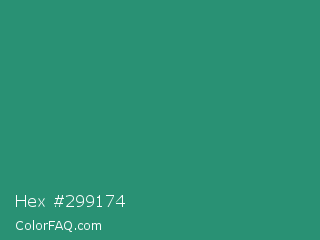 Hex #299174 Color is a normal green color and the nearest color is Illuminating Emerald #319177. Hex code #299174 and RGB value is rgb(41,145,116). In RGB color space, this color is composed of 16% red, 57% green, 45% blue, In CMYK color space, this color is composed of 72% cyan, 0% magenta, 20% yellow , 43% black , In HSL color space, this color has a hue angle of 163° , 56% saturation and 36% lightness.