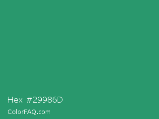 Hex #29986d Color is a normal green color and the nearest color is Illuminating Emerald #319177. Hex code #29986d and RGB value is rgb(41,152,109). In RGB color space, this color is composed of 16% red, 60% green, 43% blue, In CMYK color space, this color is composed of 73% cyan, 0% magenta, 28% yellow , 40% black , In HSL color space, this color has a hue angle of 157° , 58% saturation and 38% lightness.