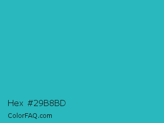 Hex #29b8bd Color is a normal cyan color and the nearest color is Maximum Blue Green #30bfbf. Hex code #29b8bd and RGB value is rgb(41,184,189). In RGB color space, this color is composed of 16% red, 72% green, 74% blue, In CMYK color space, this color is composed of 78% cyan, 3% magenta, 0% yellow , 26% black , In HSL color space, this color has a hue angle of 182° , 64% saturation and 45% lightness.