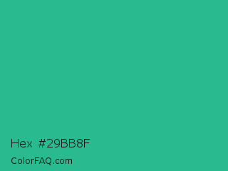 Hex #29bb8f Color is a normal green color and the nearest color is Mountain Meadow #30ba8f. Hex code #29bb8f and RGB value is rgb(41,187,143). In RGB color space, this color is composed of 16% red, 73% green, 56% blue, In CMYK color space, this color is composed of 78% cyan, 0% magenta, 24% yellow , 27% black , In HSL color space, this color has a hue angle of 162° , 64% saturation and 45% lightness.