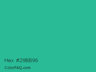 Hex #29bb96 Color is a normal cyan color and the nearest color is Mountain Meadow #30ba8f. Hex code #29bb96 and RGB value is rgb(41,187,150). In RGB color space, this color is composed of 16% red, 73% green, 59% blue, In CMYK color space, this color is composed of 78% cyan, 0% magenta, 20% yellow , 27% black , In HSL color space, this color has a hue angle of 165° , 64% saturation and 45% lightness.