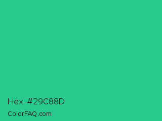 Hex #29c88d Color is a normal green color and the nearest color is Mountain Meadow #30ba8f. Hex code #29c88d and RGB value is rgb(41,200,141). In RGB color space, this color is composed of 16% red, 78% green, 55% blue, In CMYK color space, this color is composed of 80% cyan, 0% magenta, 30% yellow , 22% black , In HSL color space, this color has a hue angle of 158° , 66% saturation and 47% lightness.