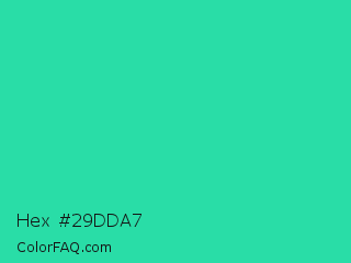Hex #29dda7 Color is a normal green color and the nearest color is Shamrock #33cc99. Hex code #29dda7 and RGB value is rgb(41,221,167). In RGB color space, this color is composed of 16% red, 87% green, 65% blue, In CMYK color space, this color is composed of 81% cyan, 0% magenta, 24% yellow , 13% black , In HSL color space, this color has a hue angle of 162° , 73% saturation and 51% lightness.