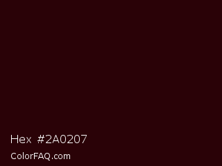 Hex #2a0207 Color is a almost black red color and the nearest color is Sepia Black #2b0202. Hex code #2a0207 and RGB value is rgb(42,2,7). In RGB color space, this color is composed of 16% red, 1% green, 3% blue, In CMYK color space, this color is composed of 0% cyan, 95% magenta, 83% yellow , 84% black , In HSL color space, this color has a hue angle of 353° , 91% saturation and 9% lightness.