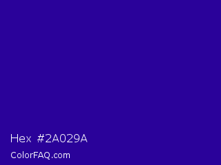 Hex #2a029a Color is a normal indigo color and the nearest color is Blue Gem #2c0e8c. Hex code #2a029a and RGB value is rgb(42,2,154). In RGB color space, this color is composed of 16% red, 1% green, 60% blue, In CMYK color space, this color is composed of 73% cyan, 99% magenta, 0% yellow , 40% black , In HSL color space, this color has a hue angle of 256° , 97% saturation and 31% lightness.