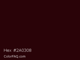 Hex #2a0308 Color is a almost black red color and the nearest color is Sepia Black #2b0202. Hex code #2a0308 and RGB value is rgb(42,3,8). In RGB color space, this color is composed of 16% red, 1% green, 3% blue, In CMYK color space, this color is composed of 0% cyan, 93% magenta, 81% yellow , 84% black , In HSL color space, this color has a hue angle of 352° , 87% saturation and 9% lightness.