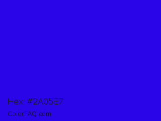 Hex #2a05e7 Color is a normal indigo color and the nearest color is Bluebonnet #1c1cf0. Hex code #2a05e7 and RGB value is rgb(42,5,231). In RGB color space, this color is composed of 16% red, 2% green, 91% blue, In CMYK color space, this color is composed of 82% cyan, 98% magenta, 0% yellow , 9% black , In HSL color space, this color has a hue angle of 250° , 96% saturation and 46% lightness.