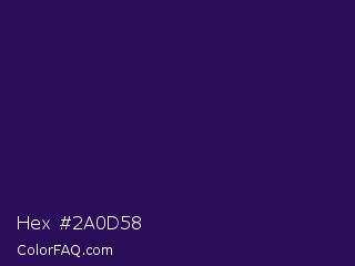 Hex #2a0d58 Color is a very dark violet color and the nearest color is Violent Violet #290c5e. Hex code #2a0d58 and RGB value is rgb(42,13,88). In RGB color space, this color is composed of 16% red, 5% green, 35% blue, In CMYK color space, this color is composed of 52% cyan, 85% magenta, 0% yellow , 65% black , In HSL color space, this color has a hue angle of 263° , 74% saturation and 20% lightness.