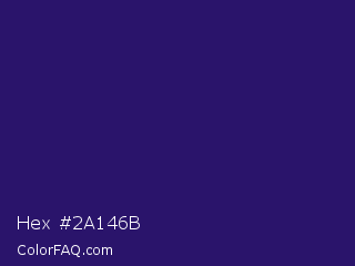 Hex #2a146b Color is a dark indigo color and the nearest color is Violent Violet #290c5e. Hex code #2a146b and RGB value is rgb(42,20,107). In RGB color space, this color is composed of 16% red, 8% green, 42% blue, In CMYK color space, this color is composed of 61% cyan, 81% magenta, 0% yellow , 58% black , In HSL color space, this color has a hue angle of 255° , 69% saturation and 25% lightness.