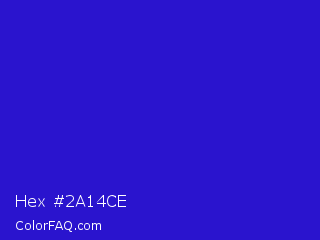 Hex #2a14ce Color is a normal indigo color and the nearest color is Interdimensional Blue #360ccc. Hex code #2a14ce and RGB value is rgb(42,20,206). In RGB color space, this color is composed of 16% red, 8% green, 81% blue, In CMYK color space, this color is composed of 80% cyan, 90% magenta, 0% yellow , 19% black , In HSL color space, this color has a hue angle of 247° , 82% saturation and 44% lightness.