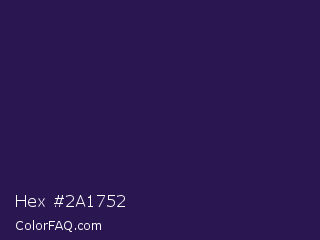 Hex #2a1752 Color is a very dark indigo color and the nearest color is Valhalla #2b194f. Hex code #2a1752 and RGB value is rgb(42,23,82). In RGB color space, this color is composed of 16% red, 9% green, 32% blue, In CMYK color space, this color is composed of 49% cyan, 72% magenta, 0% yellow , 68% black , In HSL color space, this color has a hue angle of 259° , 56% saturation and 21% lightness.