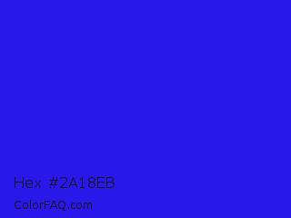 Hex #2a18eb Color is a normal indigo color and the nearest color is Bluebonnet #1c1cf0. Hex code #2a18eb and RGB value is rgb(42,24,235). In RGB color space, this color is composed of 16% red, 9% green, 92% blue, In CMYK color space, this color is composed of 82% cyan, 90% magenta, 0% yellow , 8% black , In HSL color space, this color has a hue angle of 245° , 84% saturation and 51% lightness.