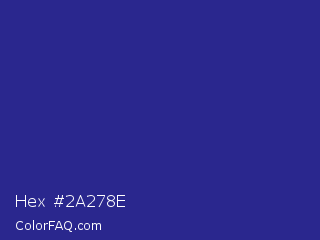 Hex #2a278e Color is a normal indigo color and the nearest color is Cosmic Cobalt #2e2d88. Hex code #2a278e and RGB value is rgb(42,39,142). In RGB color space, this color is composed of 16% red, 15% green, 56% blue, In CMYK color space, this color is composed of 70% cyan, 73% magenta, 0% yellow , 44% black , In HSL color space, this color has a hue angle of 242° , 57% saturation and 35% lightness.
