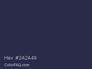 Hex #2a2a49 Color is a dark blue color and the nearest color is Port Gore #251f4f. Hex code #2a2a49 and RGB value is rgb(42,42,73). In RGB color space, this color is composed of 16% red, 16% green, 29% blue, In CMYK color space, this color is composed of 42% cyan, 42% magenta, 0% yellow , 71% black , In HSL color space, this color has a hue angle of 240° , 27% saturation and 23% lightness.